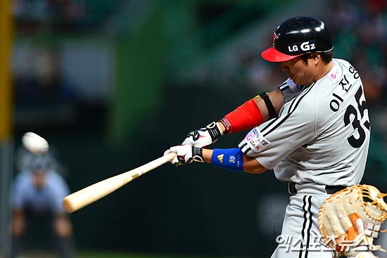 [엑스포츠뉴스 = 인천, 김성진 기자] 23일 오후 인천 문학야구장에서 열린 '2013 한국야쿠르트 세븐 프로야구' SK 와이번스와 LG 트윈스의 경기에 3회 초 2사 2루 이진영이 1타점 2루타를 터뜨리고 있다.