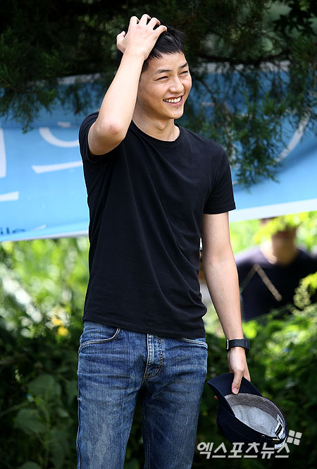 [엑스포츠뉴스 = 춘천 권태완 기자] 27일 오후 강원도 춘천 제 102보충대대로 배우 송중기가 육군현역 입대했다. 송중기가 짧은 머리를 만지며 웃고 있다.