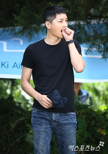 [엑스포츠뉴스 = 춘천 권태완 기자] 27일 오후 강원도 춘천 제 102보충대대로 배우 송중기가 육군현역 입대했다. 송중기가 취재진과 팬들에게 인사를 하고 있다.