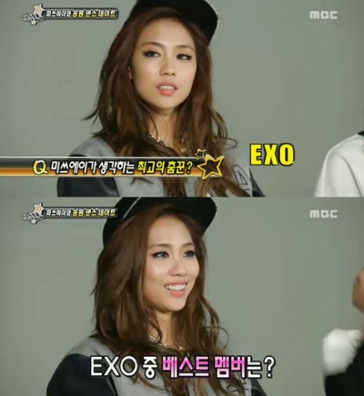 이날 리포터 에릭남이 "요즘 내가 봐도 춤을 잘춘다 싶은 사람은?"이라며 아이돌 최고의 춤꾼에 대해 질문했다.  미쓰에이 멤버들은 이구동성으로 '으르렁'으로 활동하며 많은 인기를 얻고 있는 그룹 엑소를 외쳤다.