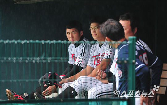 덕아웃의 선수들이 경기 진행 여부를 기다리고 있다.
