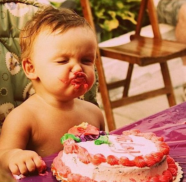 공개된 사진 속에는 외국 아기가 빨간 생크림 케이크 앞에 앉아있는 모습이 담겨있다. 아기의 주먹 쥔 손과 입술 주위로 케이크가 묻어 있는 것으로 보아 케이크를 먹기 위해 사투를 벌인 모습이 연상된다.