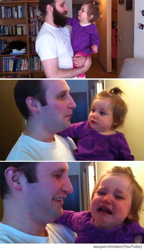 그러나 아빠가 말끔하게 면도를 한 뒤 딸을 다시 안자 아기는 이내 울음을 터뜨렸다. 수염을 깎은 아빠를 본 아기는 아빠를 알아보지 못하고 낯선 사람에게 안긴 줄 알고 울음을 터뜨린 것이다.