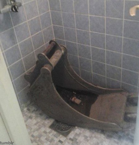 엄청난 무게의 굴착기 삽이 어떻게 집 안의 욕실까지 들어오게 됐는지 궁금증을 자아낸다.