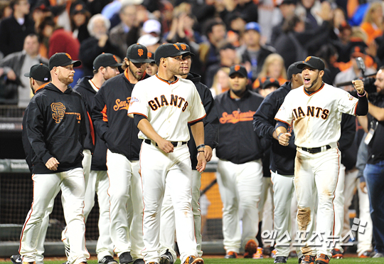승리를 거둔 샌프란시스코 선수들이 기뻐하며 그라운드로 나오고 있다.