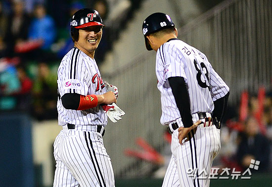 [엑스포츠뉴스 = 권태완 기자] 29일 오후 서울 잠실야구장에서 열린 '2013 프로야구' 삼성 라이온즈와 LG 트윈스의 경기에 이진영이 6회말 2사 주자 2-3루 5:4에 이진영이 2타점 적시타를 치고 기뻐하고 있다.