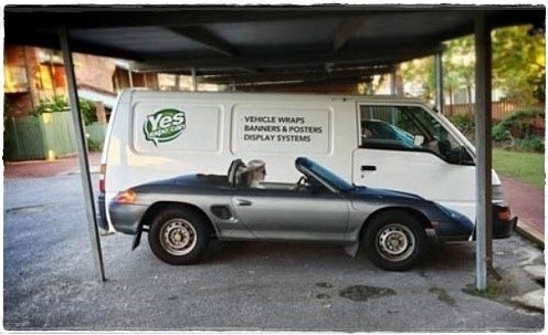 그러나 이 사진을 자세히 보면 차가 한 대 뿐이다. 승합차의 아래쪽 바퀴 달린 부분에 스포츠카 모양을 그려 넣어 실제 스포츠카가 있는 듯한 착시 효과를 불러 일으킨다.