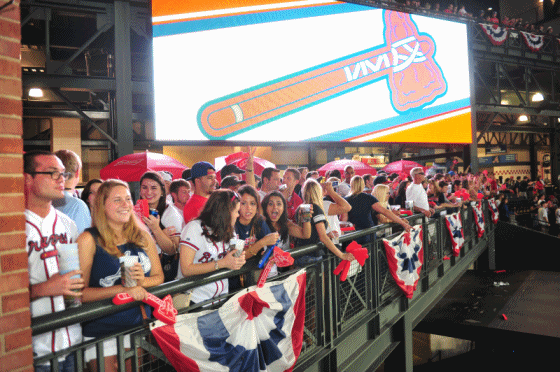 일제히 일어나 함성과 함께 도끼 응원을 펼치는 애틀란타 관중.