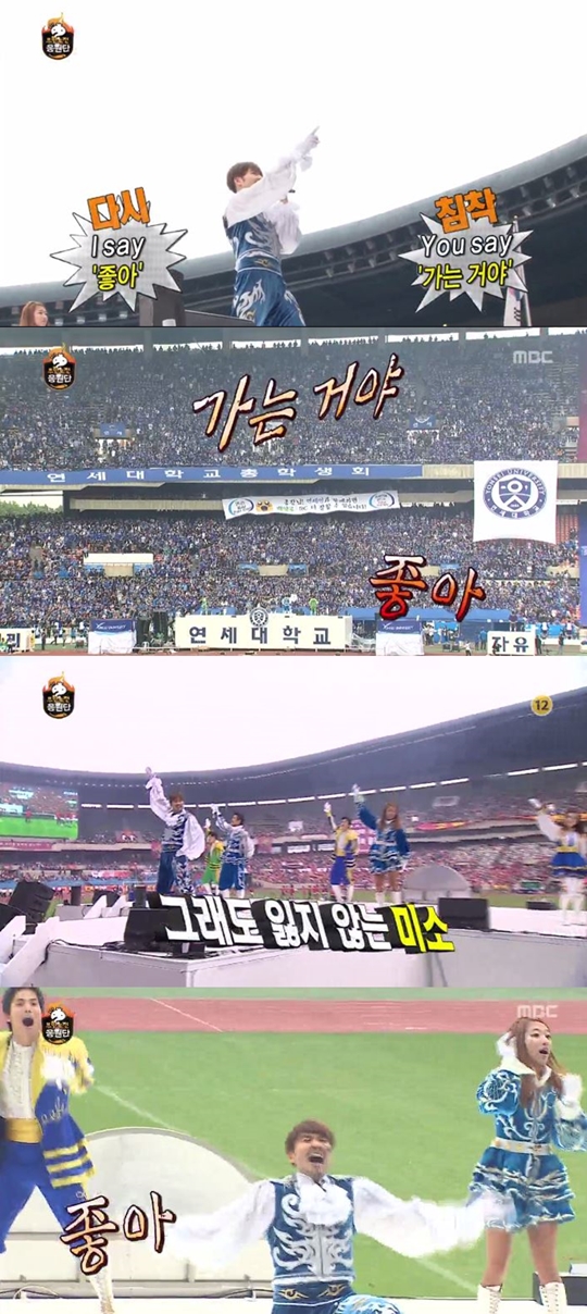 응원전 당일 노홍철은 멤버들 없이 혼자 무대에 올라 "I Say 좋아 You say 가는거야"라고 외친 후 관중석에 모인 학생들과 구호를 주고 받으며 경기장을 열광의 도가니로 물들였다.
