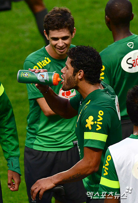 [엑스포츠뉴스 = 권태완 기자] 11일 오후 서울 상암동 서울월드컵경기장에서 열린 브라질 축구대표팀 공식 훈련에 헐크가 훈련중 물을 마시고 있다.