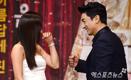 [엑스포츠뉴스 = 권태완 기자] 24일 오후 서울 한남동 그랜드 하얏트 서울에서 열린 MBC 월화 특별기획 '기황후' 제작발표회에 하지원(왼쪽)과 주진모가 장난을 치고 있다.