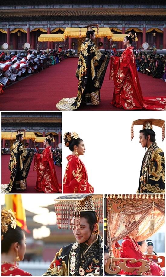 공개된 사진 속에는 기황후 역을 맡은 하지원이 원나라 황제 역의 지창욱과 함께 대례식을 하는 모습이 담겨있다.