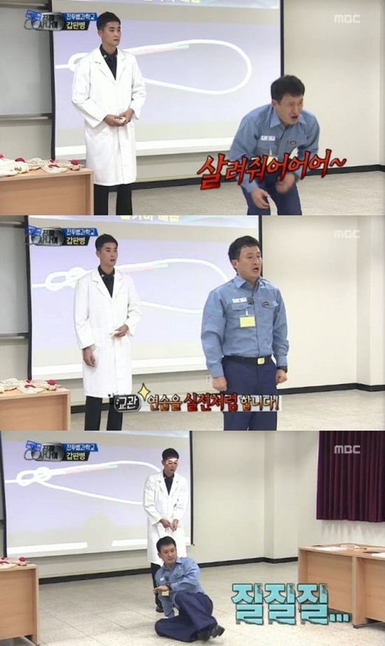 이날 서경석은 갑판병 훈련을 받게 됐고, 교관의 요청에 앞으로 나가 물에 빠진 익수자 연기를 선보였다.
