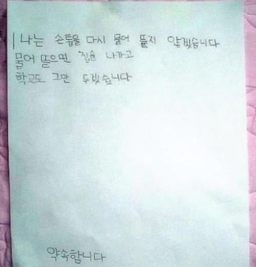 게재된 사진에는 손톱을 물어뜯는 버릇을 가진 한 아이가 쓴 각서가 담겼다. 각서에는 "나는 손톱을 다시 물어 뜯지 않겠습니다. 물어 뜯으면 집을 나가고 학교도 그만 두겠습니다. 약속합니다"라고 써있다.