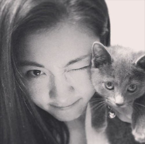 이 사진 속에서 하지원은 윙크하며 고양이를 안은 채 카메라를 바라보고 있다.