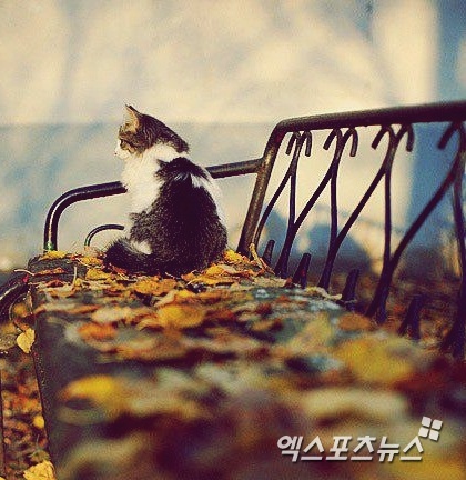 다 내려놓은 고양이 사진에는 낙엽이 깔려 있는 벤치 위에 앉아 있는 고양이의 모습이 담겨 있다.