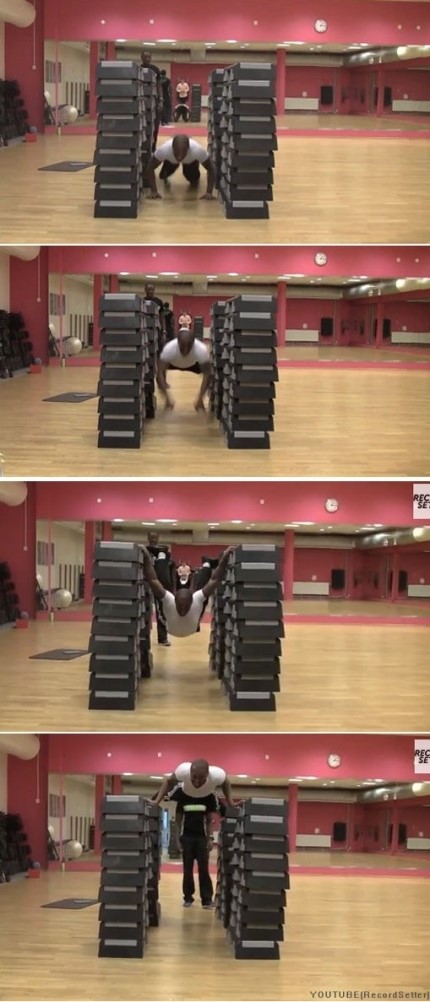 공개된 '점프 푸시업에 성공한 남자' 영상에서 이 남자는 임시 벽체 사이에 서서 양손을 벽체에 짚은 뒤 점프 푸시업을 하고 있다.