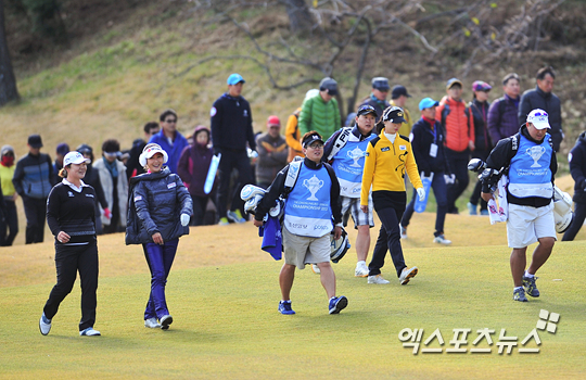 [엑스포츠뉴스=순천, 권혁재 기자] 17일 전남 순천시 승주 컨트리클럽(파72/6,642야드)에서 열린 KLPGA 투어 '조선일보-포스코 챔피언십 2013'(총상금 5억, 우승상금 1억) 최종 3라운드 경기, 챔피언조 이민연(21, LIG손해보험), 김하늘(25KT), 허윤경(23,SBI)이 4번홀 세컨샷을 위해 이동하고 있다.