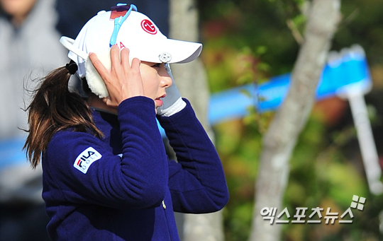 [엑스포츠뉴스=순천, 권혁재 기자] 17일 전남 순천시 승주 컨트리클럽(파72/6,642야드)에서 열린 KLPGA 투어 '조선일보-포스코 챔피언십 2013'(총상금 5억, 우승상금 1억) 최종 3라운드 경기, 김자영(22, LG)이 1번홀 티샷을 한 후 귀마개를 착용하고 있다.