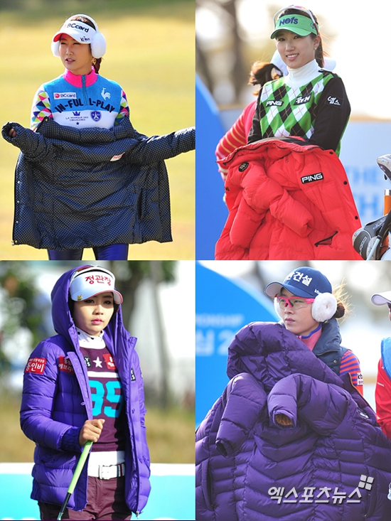 [엑스포츠뉴스=순천, 권혁재 기자] 17일 전남 순천시 승주 컨트리클럽(파72/6,642야드)에서 열린 KLPGA 투어 '조선일보-포스코 챔피언십 2013'(총상금 5억, 우승상금 1억) 최종 3라운드 경기, 쌀쌀한 날씨로 인해 선수들이 재킷을 입고 경기를 시작하지만 필드에서는 앞으로 입은채 샷을 기다리고 있다.