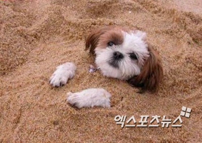 주인이 그리운 개 사진 속 시츄는 모래 밭에 깊숙히 묻혀 얼굴만 내놓고 있다.