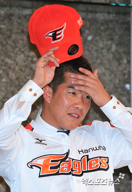 [엑스포츠뉴스=권혁재 기자] 27일 오후 서울 중구 소공로 플라자호텔 22층 다이아몬드홀에서 열린 프로야구 한화 이글스 '정근우-이용규 선수 입단 기자회견'에서 한화 정근우가 새 유니폼과 모자를 착용하고 있다.