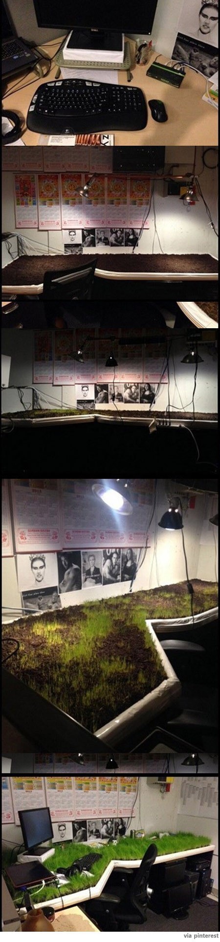 공개된 '잔디밭 책상' 사진 속에는 직장 동료가 약 3주간 휴가를 떠난 사이 평범한 사무용 책상을 잔디밭으로 변신 시키는 과정이 담겨있다. '잔디밭 책상'을 만드는 과정은 첫 번째로 책상 위에 흙을 덮고 잔디 씨를 뿌리는 것이다.