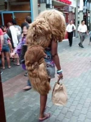 이 금색 뭉치는 바로 이 여성의 머리카락이다. 사람 키 만한 길이의 머리카락을 가진 이 여성은 마치 짐을 짊어지고 가는 듯한 모습을 보여 눈길을 끌었다.