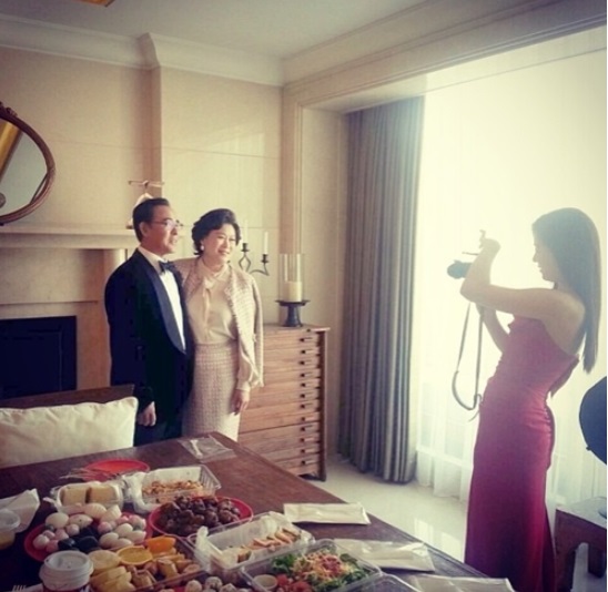 공개된 사진에는 하지원의 가족사진 촬영 현장이 담겨 있다. 어깨가 드러나는 보랏빛의 롱드레스를 입은 하지원은 카메라를 들고 말끔히 옷을 차려입은 부모님의 사진을 찍고 있다.