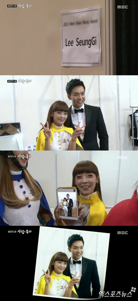 소율은 14일 방송된 '휴먼다큐 사람이 좋다'에서 MAMA 공연 대기실에 있는 이승기에게 방문해 사진을 찍었다.