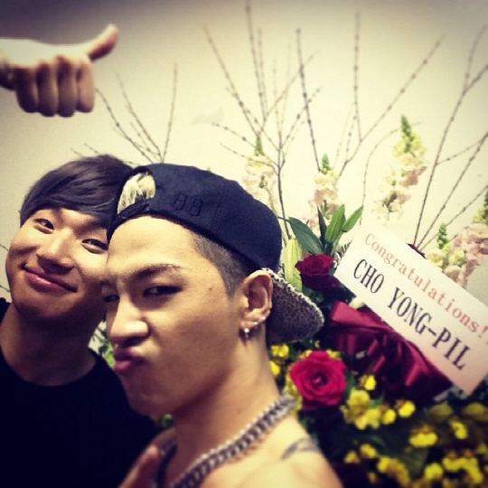 공개된 사진 속에는 태양이 빅뱅의 멤버 대성과 꽃다발 앞에서 포즈를 취하고 있다.