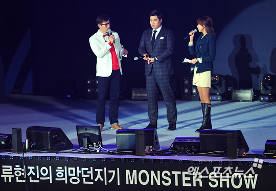 [엑스포츠뉴스=권혁재 기자] 22일 오후 서울 고려대 화정체육관에서 열린 '류현진의 희망던지기 몬스터쇼'에서 LA 다저스 류현진이 무대에 나와 인사를 하고 있다.