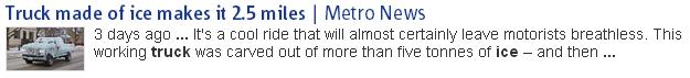 얼음으로 만든 자동차와 관련, 메트로에 따르면 이 업체는 핸들과 엔진, 타이어 등을 제외한 나머지를 차량의 기본 프레임 위에 얼음으로 만든 외부모양을 올렸다.