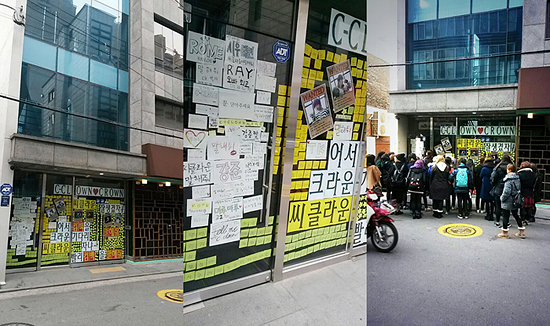 [엑스포츠뉴스=백종모 기자] 아이돌 씨클라운(롬, 강준, 시우, 레이, 티케이, 마루)의 팬클럽 크라운이 씨클라운의 컴백을 조속히 외치며 소속사 앞에 벽보를 붙이는 이색 시위를 벌였다.