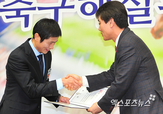 [엑스포츠뉴스=권혁재 기자] 16일 오후 서울 여의도 KBS 신관 5층 국제회의장에서 열린 '이영표 KBS 축구해설위원 위촉식'에서 이영표 해설위원이 임창건 보도본부장으로부터 위촉장을 받고 악수를 나누고 있다.