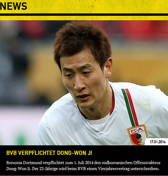 도르트문트는 17일(이하 한국시간) 구단 홈페이지를 통해 지동원의 영입을 공식화했다. 지동원의 팀 합류 시점은 2014년 7월 2일로 "지동원과 4년 계약을 체결했다"고 밝혔다.