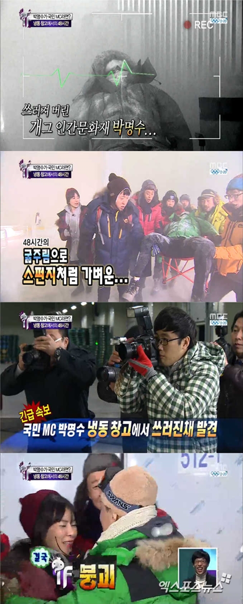 이날 멤버들은 냉동 창고에서 48시간 버티기에 도전했지만 혹독한 추위에 결국 포기했다. 그러나 박명수는 "시청자 분들과 약속이다. 저 혼자라도 여기를 지킬 테니까 스태프들은 다 들어가라"라며 혼자서 냉동창고를 지켰다.