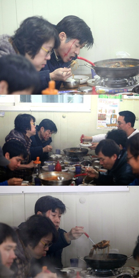 촬영 뒤 공개된 식당 사진에서 김상중은 머리에 피를 흘린 채로 스태프들과 식사를 하고 있다.