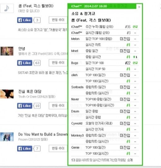 공개된 사진은 음원사이트의 차트 순위가 담겨있으며 1위를 차지하고 있는 소유와 정기고의 듀엣곡 '썸(some)'이 돋보인다.