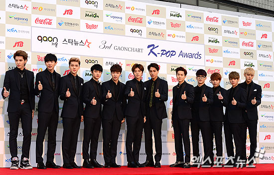 [엑스포츠뉴스 = 권태완 기자] 12일 오후 서울 방이동 올림픽공원내 체조경기장에서 열린 '제3회 가온챠트 K-POP 어워즈' 레드카펫 행사에 엑소가 포즈를 취했다.