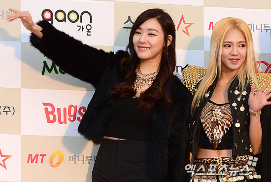 [엑스포츠뉴스 = 권태완 기자] 12일 오후 서울 방이동 올림픽공원내 체조경기장에서 열린 '제3회 가온챠트 K-POP 어워즈' 레드카펫 행사에 소녀시대 티파니와 효연이 인사를 하고 있다.