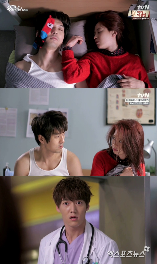22일 방송된 tvN '응급남녀' 9화에서는 오창민(최진혁 분)이 국천수(이필모)와 오진희(송지효)가 한 침대에 있는 것을 보고 경악하는 장면이 그려졌다.