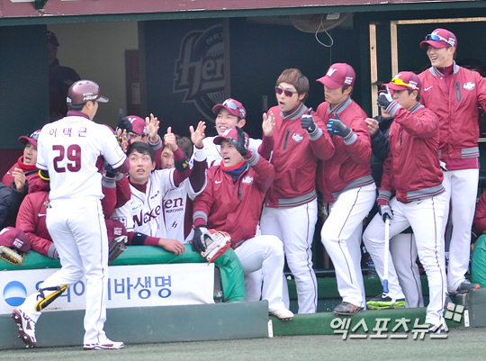 [엑스포츠뉴스=권혁재 기자] 8일 오후 서울 목동야구장에서 '2014 프로야구 시범경기' 넥센 히어로즈와 두산 베어스의 경기, 두산이 3-1로 앞선 4회말 선두타자 이택근이 솔로포를 날리고 들어와 동료들의 축하를 받고 있다.