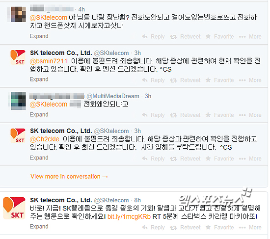 SK텔레콤 트위터느 이날 오후 7시께 "이용에 불편 드려 죄송합니다. 해당 증상에 관련하여 현재 확인을 진행하고 있습니다. 확인 후 멘션 드리겠습니다. 시간 양해를 부탁드립니다"라고 두 차례 적었다.