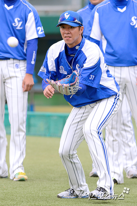 [엑스포츠뉴스=대구, 김한준 기자] 11일 오후 대구시민야구장에서 열린 '2014 한국 야쿠르트 세븐 프로야구' SK 와이번스와 삼성 라이온즈의 경기, 경기 전 삼성 임창용이 수비연습을 하고있다.