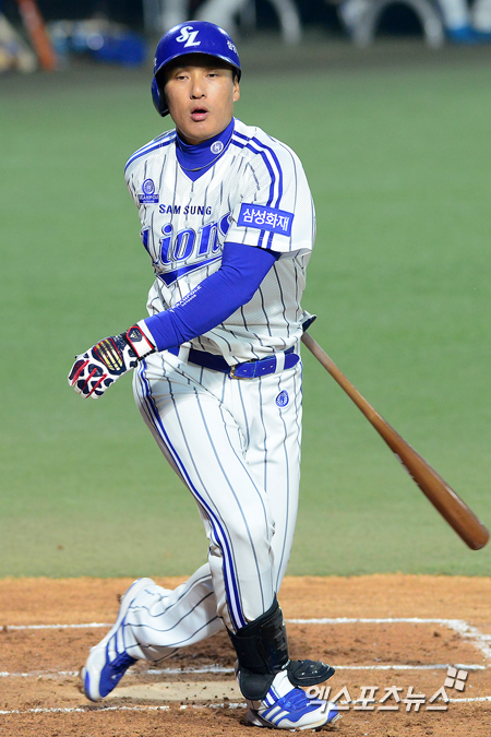 [엑스포츠뉴스=대구, 김한준 기자] 11일 오후 대구시민야구장에서 열린 '2014 한국 야쿠르트 세븐 프로야구' SK 와이번스와 삼성 라이온즈의 경기, 2회말 1사 삼성 이승엽이 헛스윙 후 아쉬워하고 있다.