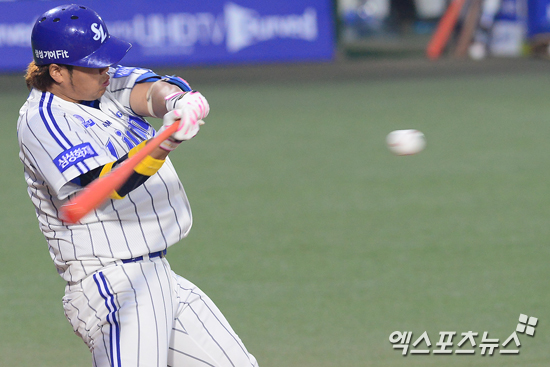 [엑스포츠뉴스=대구, 김한준 기자] 12일 오후 대구시민야구장에서 열린 '2014 한국 야쿠르트 세븐 프로야구' SK 와이번스와 삼성 라이온즈의 경기, 5회말 무사 1, 2루 삼성 채태인이 안타를 치고 있다.