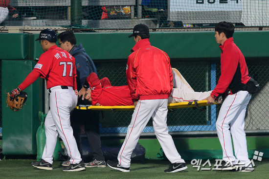 [엑스포츠뉴스=대구, 김한준 기자] 12일 오후 대구시민야구장에서 열린 '2014 한국 야쿠르트 세븐 프로야구' SK 와이번스와 삼성 라이온즈의 경기, 5회말 1사 SK 박진만이 부상으로 들것에 실려 나가고 있다.