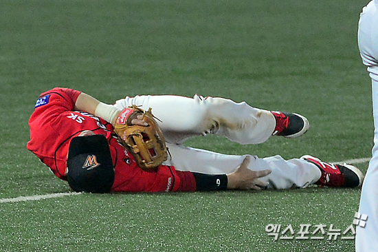 [엑스포츠뉴스=대구, 김한준 기자] 12일 오후 대구시민야구장에서 열린 '2014 한국 야쿠르트 세븐 프로야구' SK 와이번스와 삼성 라이온즈의 경기, 5회말 SK 박진만이 부상에 고통스러워 하고 있다.