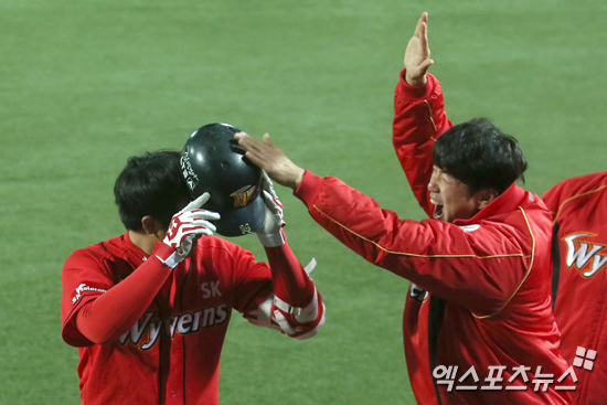 [엑스포츠뉴스=대구, 김한준 기자] 12일 오후 대구시민야구장에서 열린 '2014 한국 야쿠르트 세븐 프로야구' SK 와이번스와 삼성 라이온즈의 경기, 7회초 무사 1루 투런홈런을 친 SK 최정이 김광현의 축하를 받고 있다.